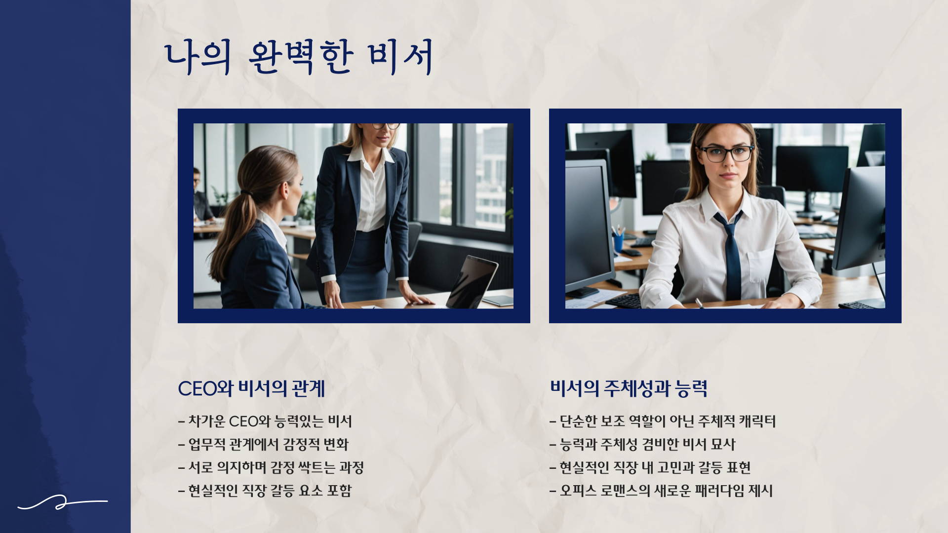 ‘나의 완벽한 비서’는 차가운 성격의 완벽주의 CEO와 그의 비서 사이에서 벌어지는 감정 변화를 그린 오피스 로맨스예요. 두 사람의 관계가 처음엔 업무적인 관계로 시작되지만, 점점 서로에게 의지하게 되면서 감정이 싹트는 과정이 너무 매력적이었어요.